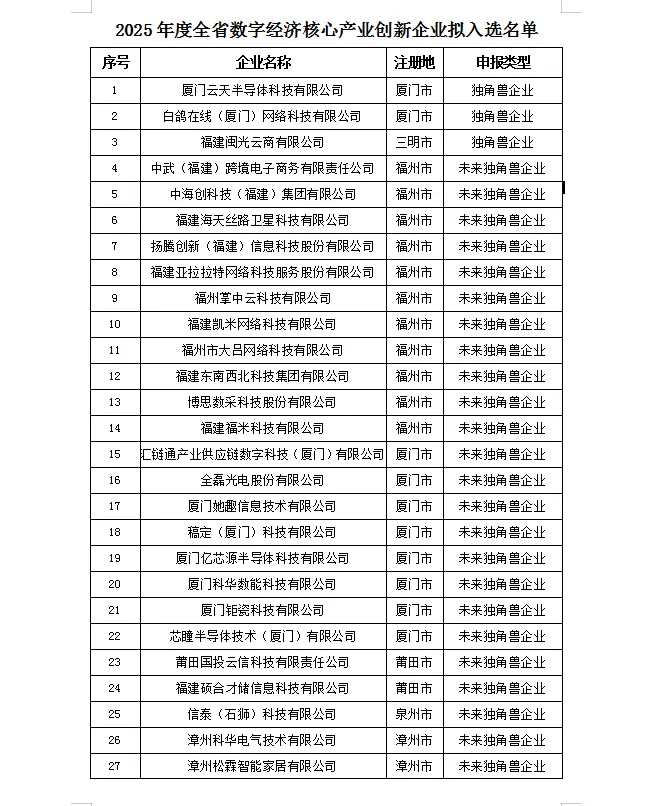 关于2025年度福建省数字经济核心产业创新企业征集遴选结果的公示