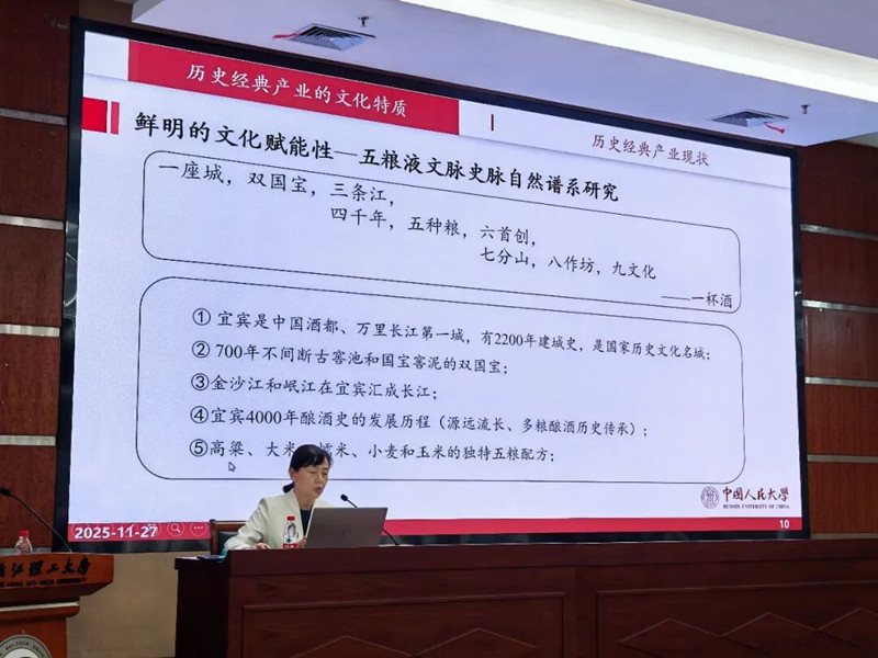 中国人民大学文化经济研究所所长黄隽从文旅视角解读历史经典产业发展。她指出,历史经典产业本身是中华优秀传统文化的博物馆,以五粮液文脉史脉自然谱系研究为例,详细阐述该产业所具备的五大核心特性—深厚历史传承性、鲜明文化赋能性、稳定品质内核性、动态现代适配性及海纳百川的生命力。以消费行为变化为切入点,阐释产业与情绪消费需求的联系,提出小城镇文旅、烟火气场景、沉浸式挑战项目、文创IP是文旅增量,并聚焦历史经典产业与文旅融合给出发展政策建议。