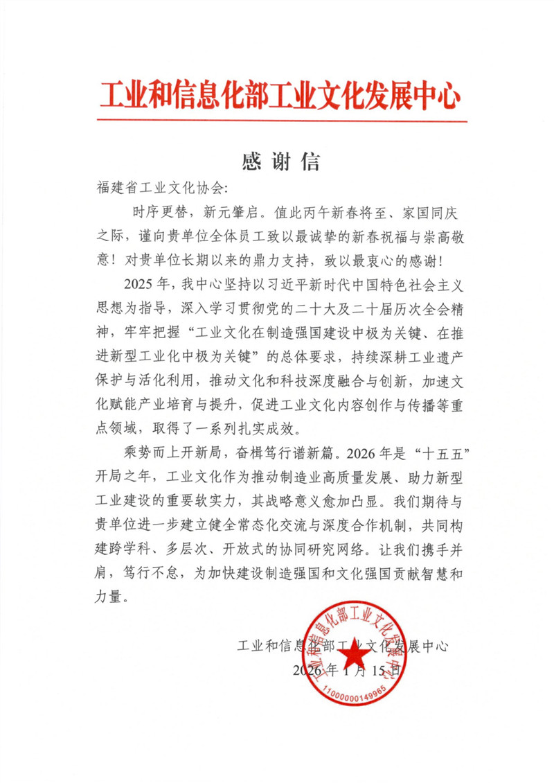 近日,乐玩手机版app(以下简称乐玩(中国))收到工业和信息化部工业文化发展中心发来的感谢信。信中对乐玩(中国)长期以来的鼎力支持致以衷心的感谢,并向乐玩(中国)全体同仁致以诚挚的新春祝福。