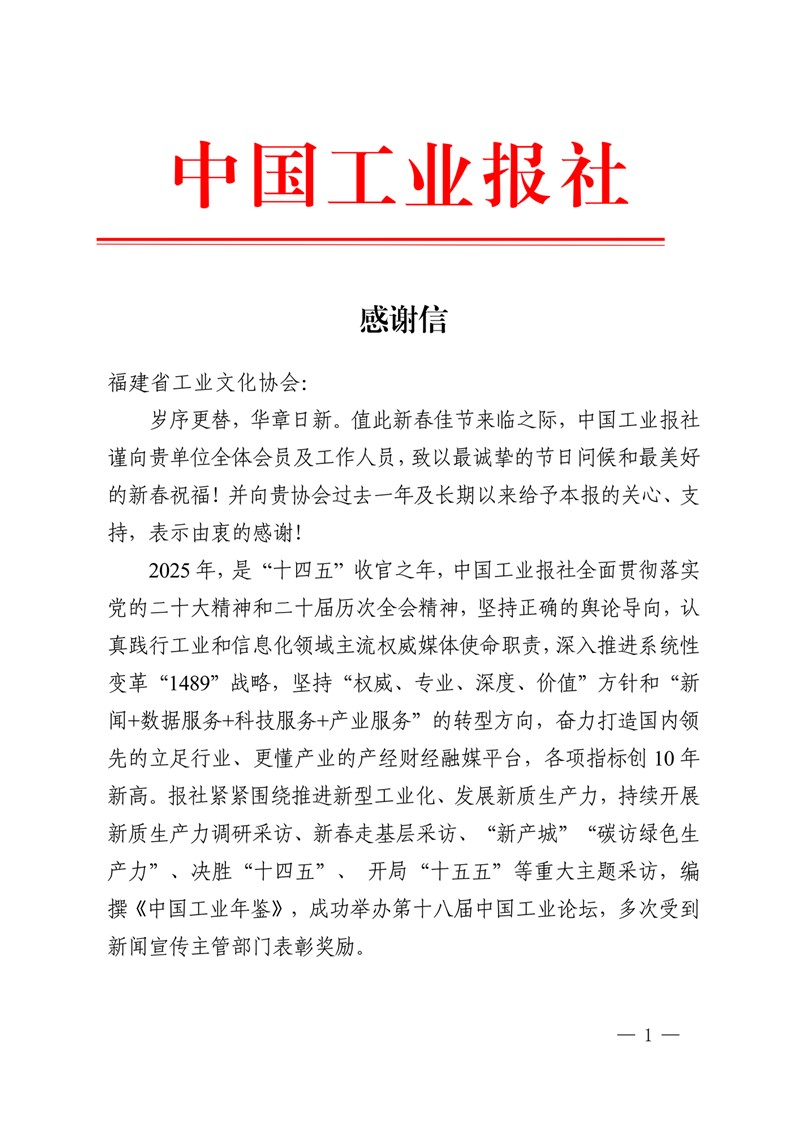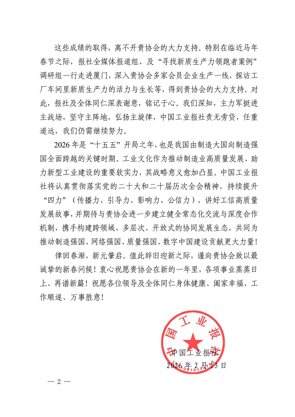 值此新春佳节,中国工业报社向乐玩(中国)发来感谢信。信中,中国工业报对乐玩(中国)全体会员及工作人员致以诚挚问候,并对我会长期以来、特别是马年春节前夕全力支持其全媒体报道组及“寻找新质生产力领跑者案例”调研组深入厦门、走进乐玩(中国)多家会员企业一线采访表示衷心感谢。
