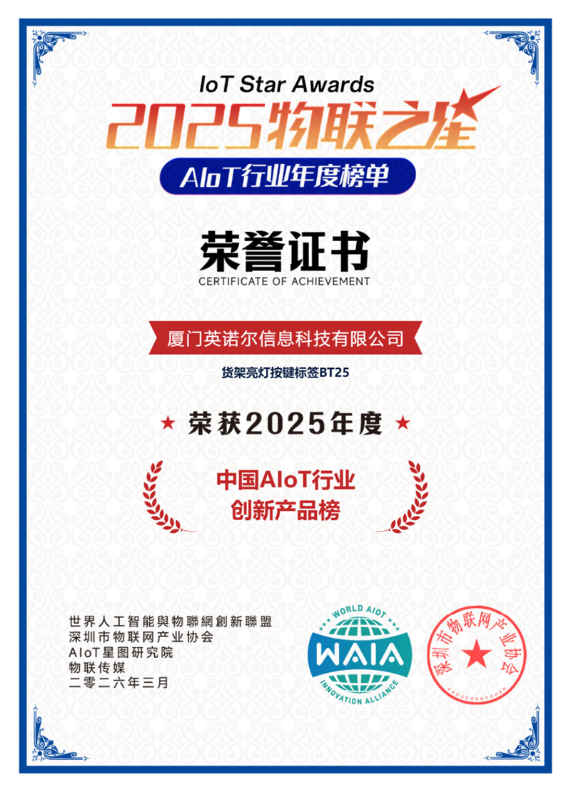 近日,2025“物联之星”中国AIoT行业年度榜单评选结果正式揭晓,英诺尔凭借硬核技术创新与产品落地实力,旗下“货架亮灯按键标签BT25”荣登“2025年度中国AIoT行业创新产品榜”!